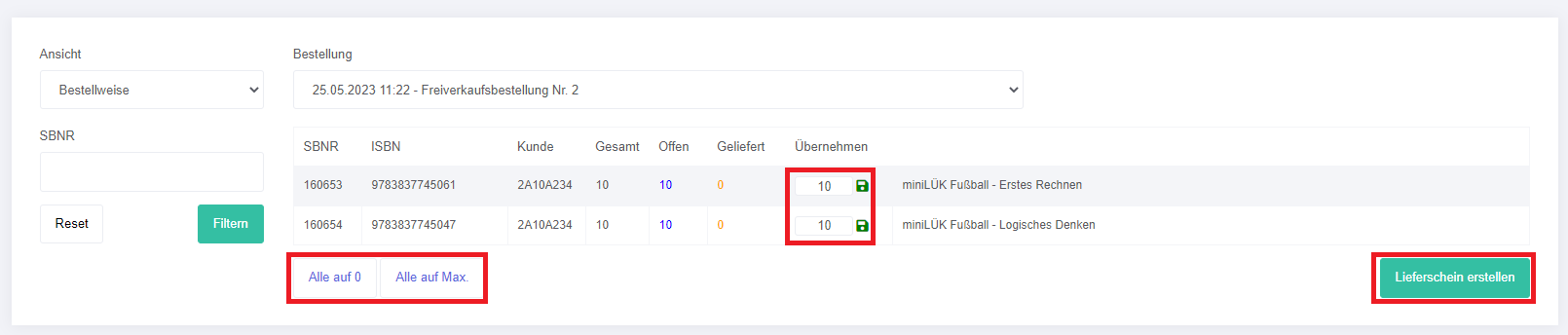 Das Mengenfeld ist bereits mit der Maximalmenge vorausgefüllt. Sie können auch alle Positionen auf "0" oder "Max" setzen.